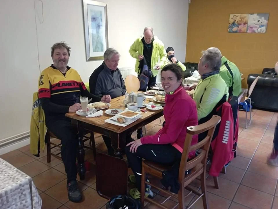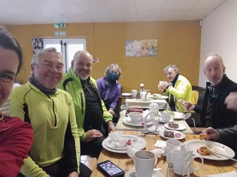 Jim, John and I set off from Wilmslow, whilst Simon Gr, Simon Ga, John B, Rebecca and Mark rode from Macclesfield. The roads were dry and the only hazard was icy puddles at the edges of the road, so no black ice. The two groups arrived within a few minutes of each other, just as the first few snow flakes started to land.
